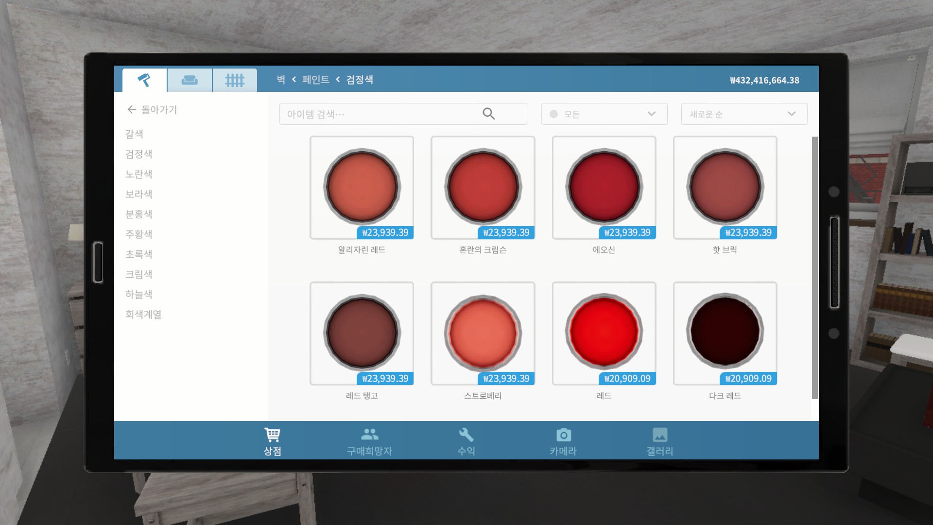 하우스 플리퍼 1편의 가구와 페인트 색상 입니다.