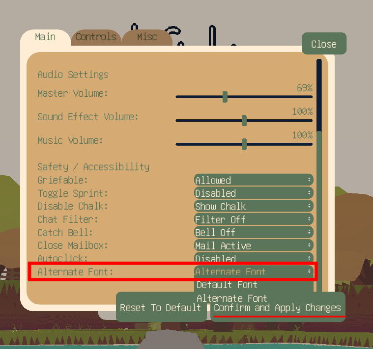 Alternate Font 설정을 Defaul Font 에서 Alternate Font 로 바꿔주신 다음 Confrim and Apply Changes 버튼을 클릭 해주세요!