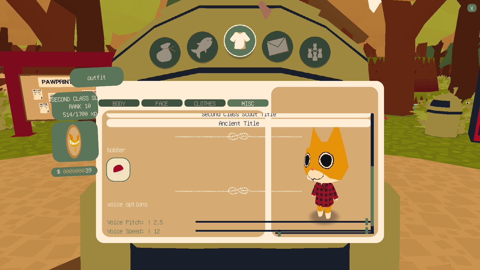 맨 오른쪽의 MISC 메뉴는 타이틀 (물고기를 잡거나 상점에서 npc에게서 구매할 수 있습니다)을 장착하거나