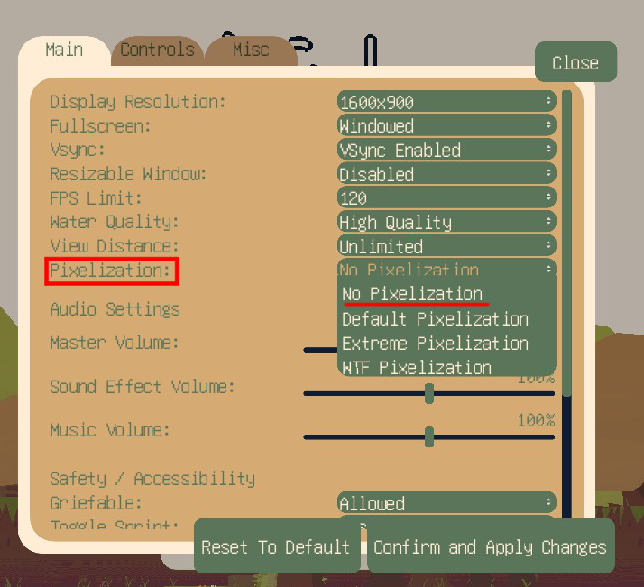 No Pixelization 을 선택하면 도트 그래픽이 느낌이 사라지고 좀 더 매끈해진 그래픽의 게임이 됩니다.