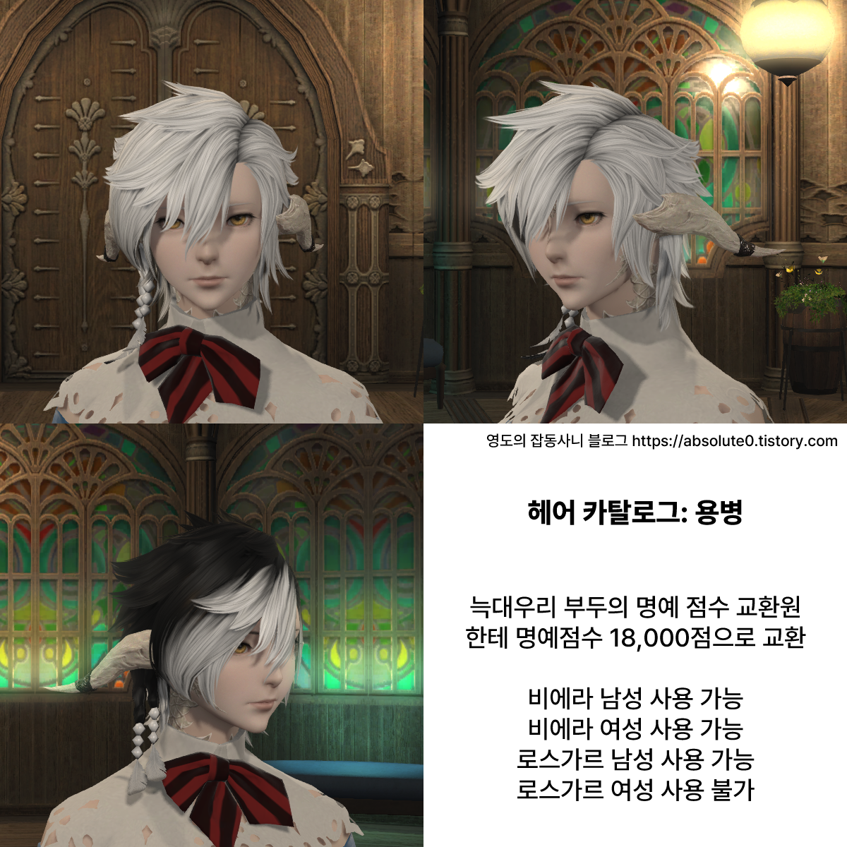 ※ 비에라와 로스가르 같은 일부 종족의 경우 차후 패치를 통해 이용 불가능한 헤어가 이용 가능해질 수도 있으니 업데이트를 기다려주세요.