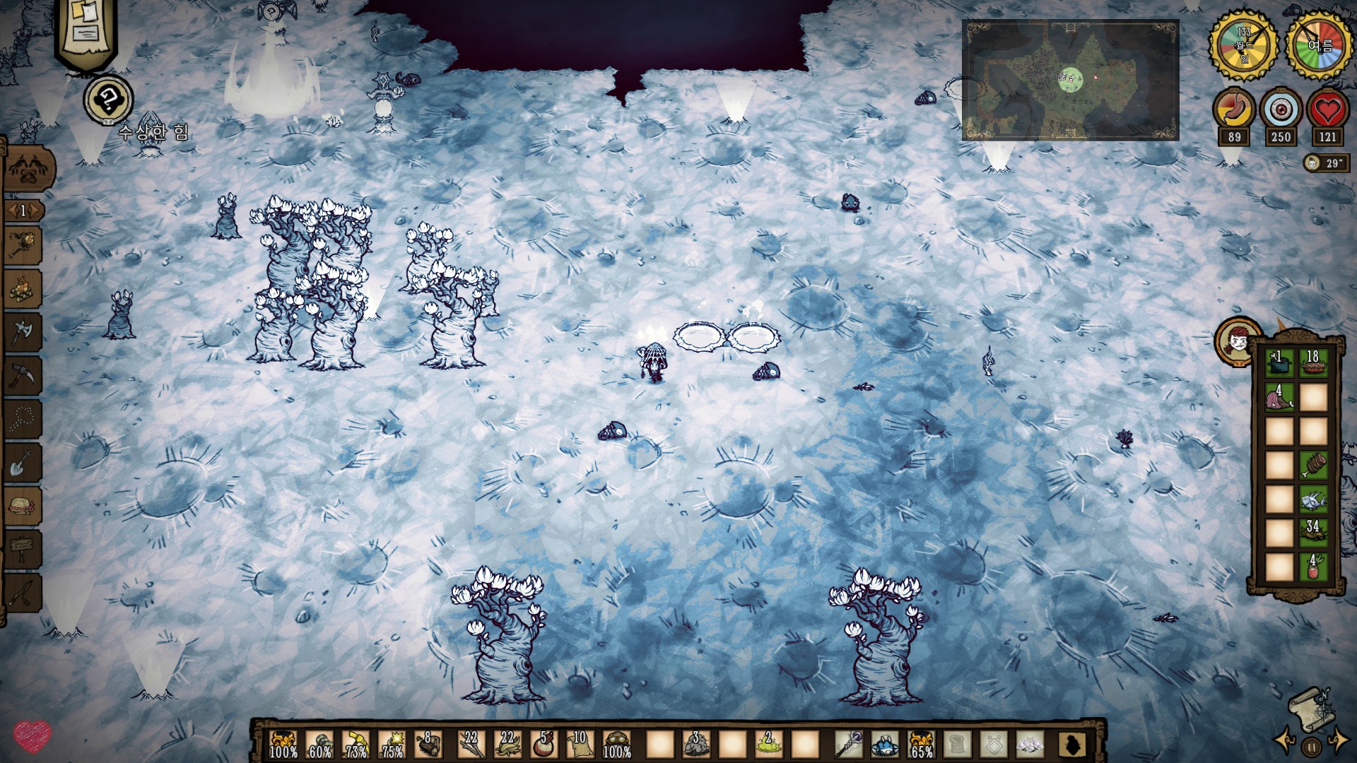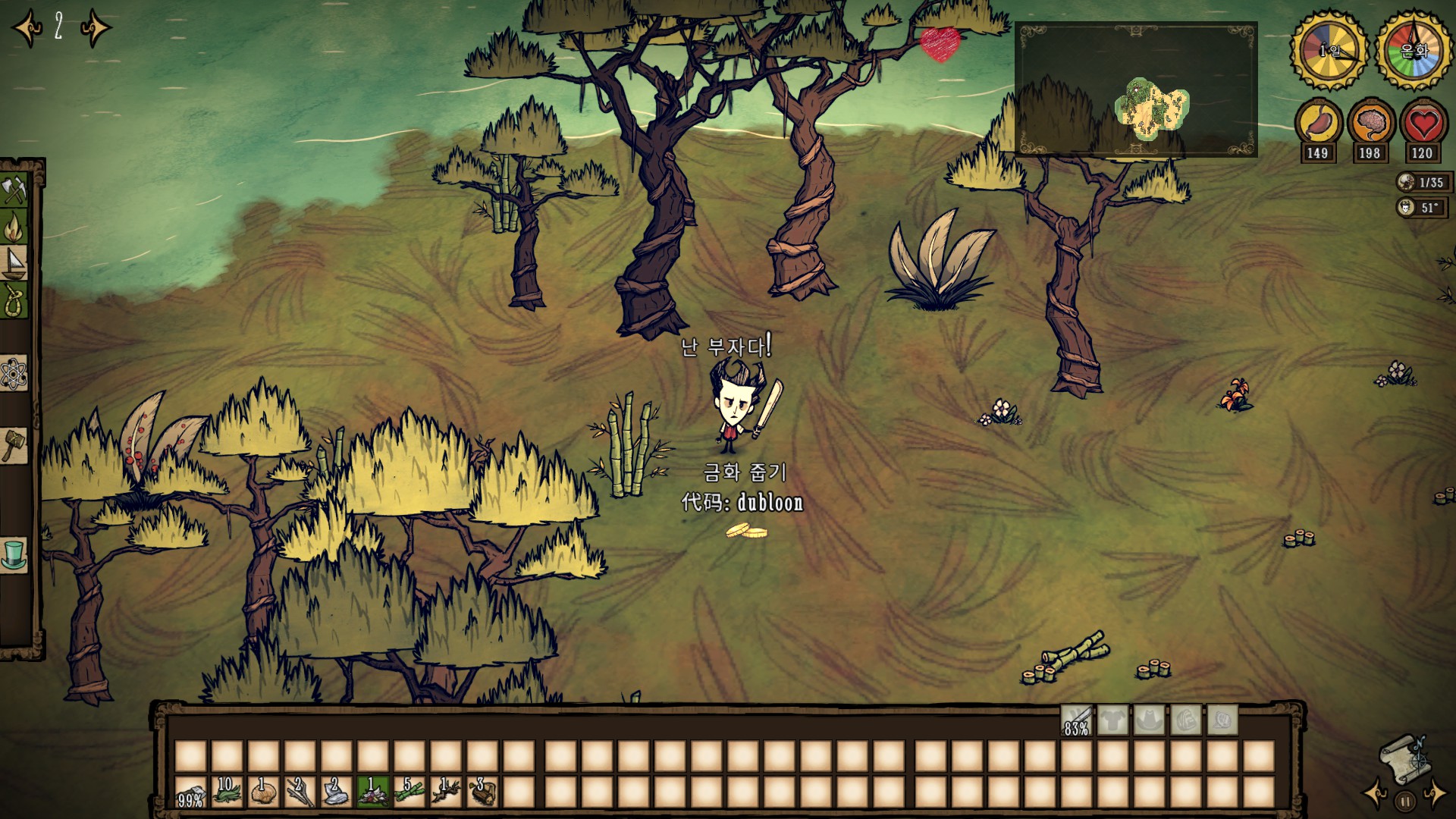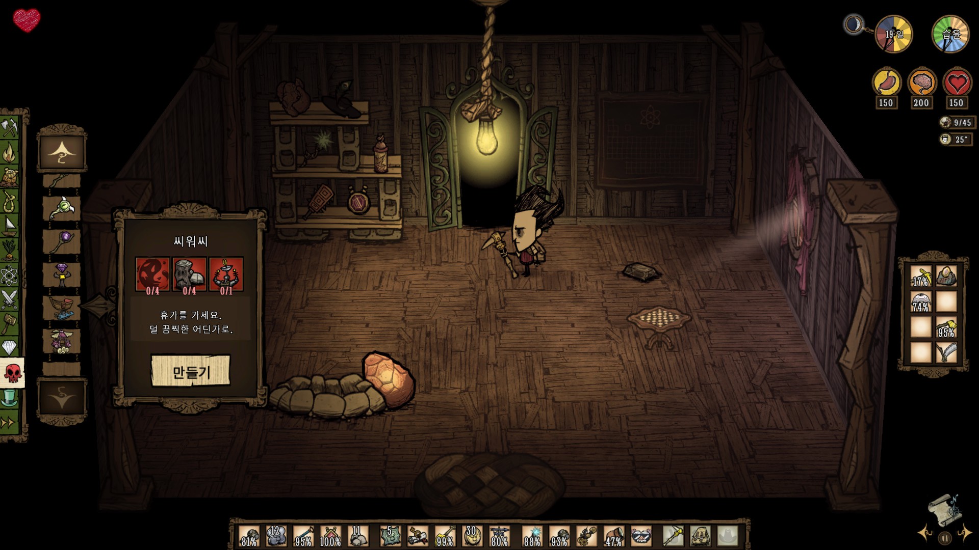 또한 돈스타브는 처음 시작 시 플레이 가능한 캐릭터는 윌슨 한개 뿐이고 나머지는 해제를 해야 됩니다.