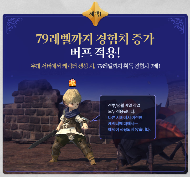 새로 시작하는 모험가를 위해 80레벨까지 넉넉한 지원품 지급! 신생 에오르제아부터 칠흑의 반역자까지 주요 퀘스트를 완료하면 성장 지원 아이템을 드립니다.