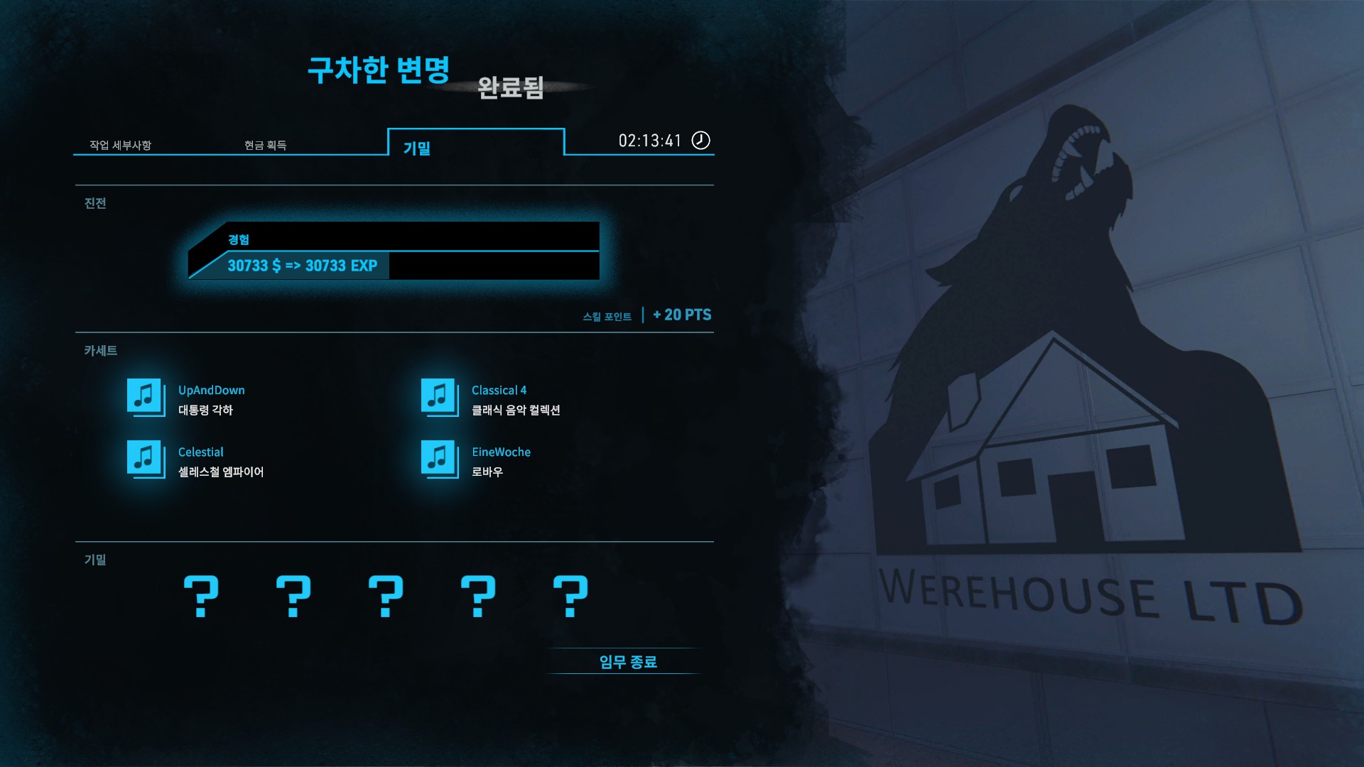 미션을 클리어 하면 결과창에서 미션 클리어율과 수집요소를 얼마나 획득했는지 알 수 있습니다.